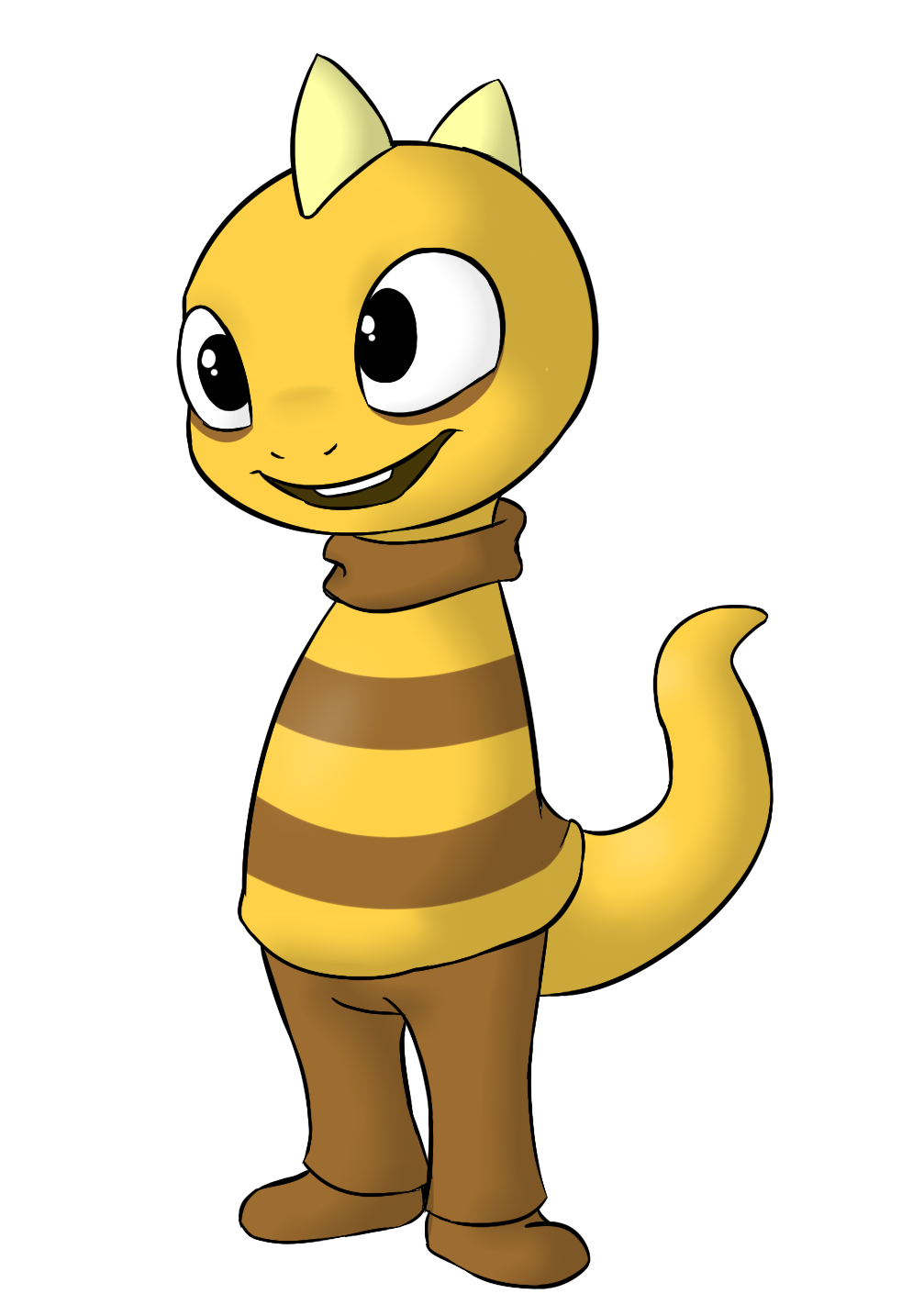 Description: A cartoon cat with a scarf around its neck and eyes wide open.