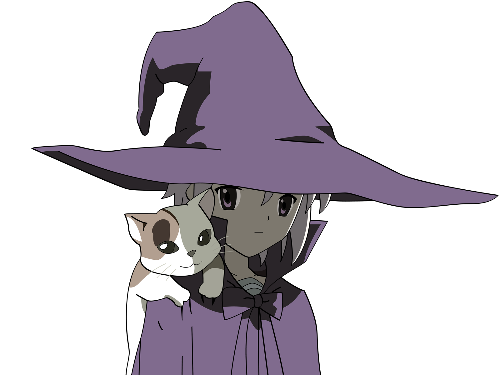 Description: A cartoon character with a cat in a witches hat and a purple outfit with a cat on her lap.