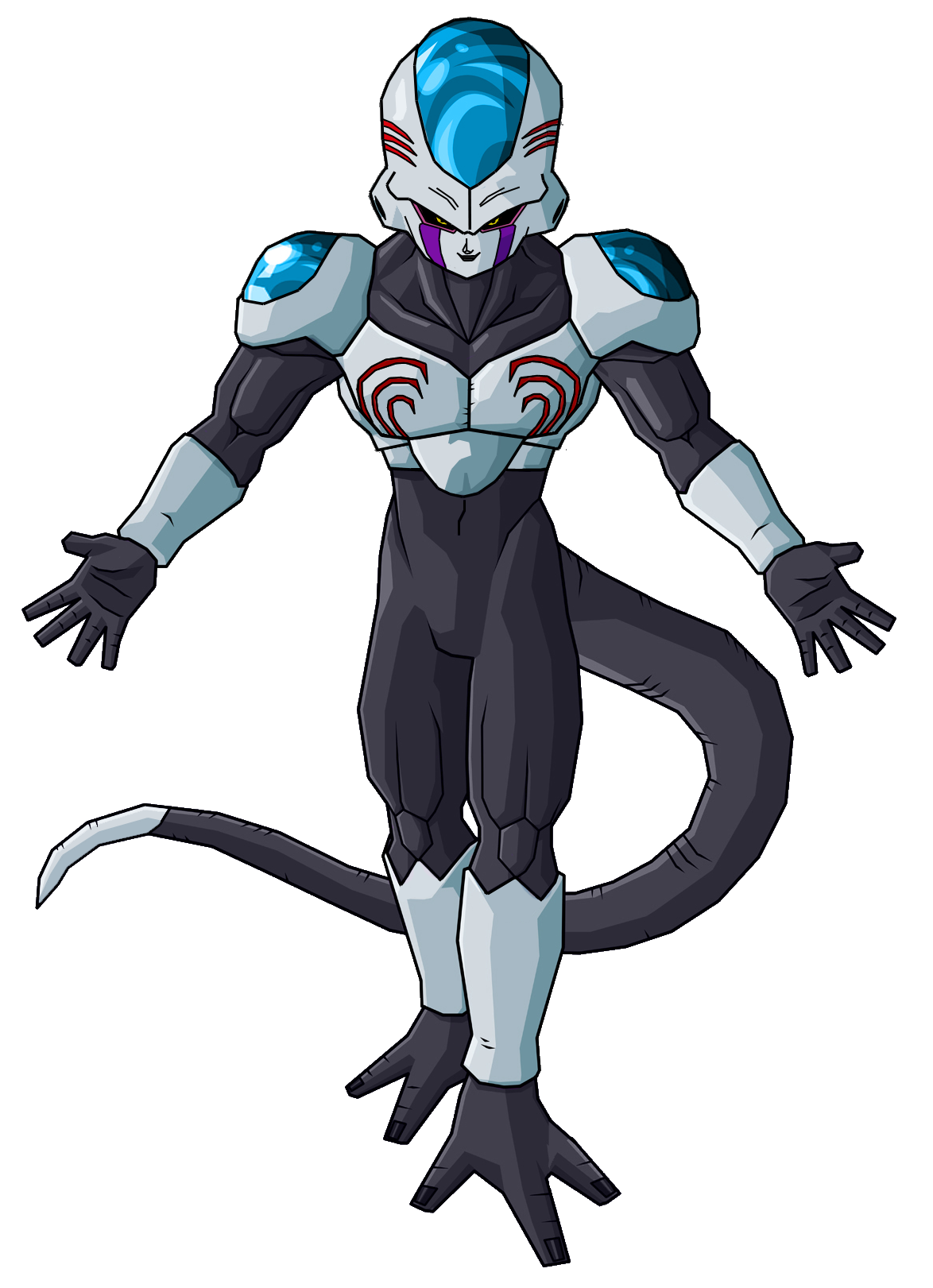 Description: A cartoon character with a blue and white outfit and a black and white tail and a blue and white helmet.