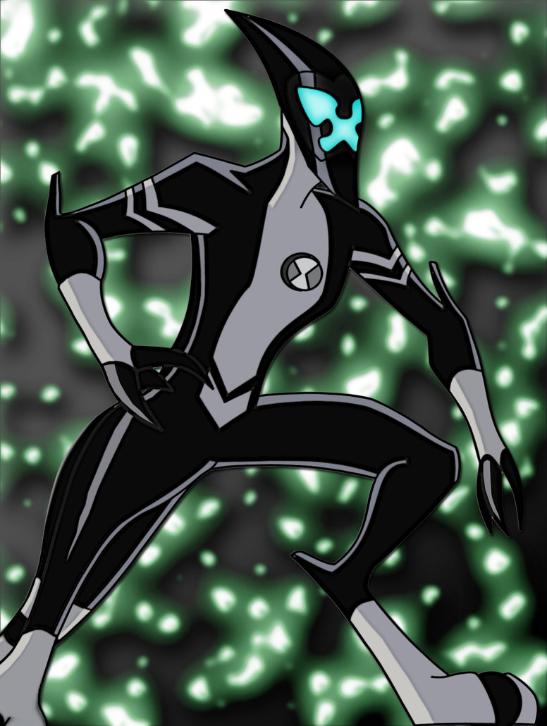Description: A cartoon character in a black and white suit and blue eyes running through a field of green and white stars.