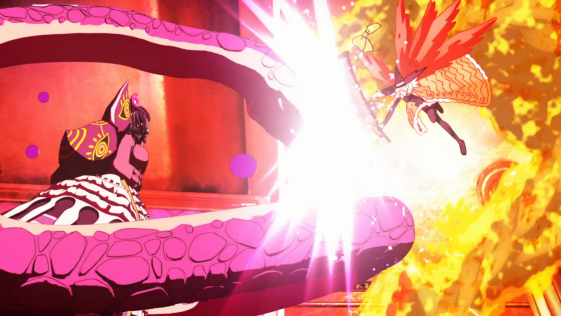 Description: A cartoon character is in a boat with a dragon flying over it and a fire behind him.