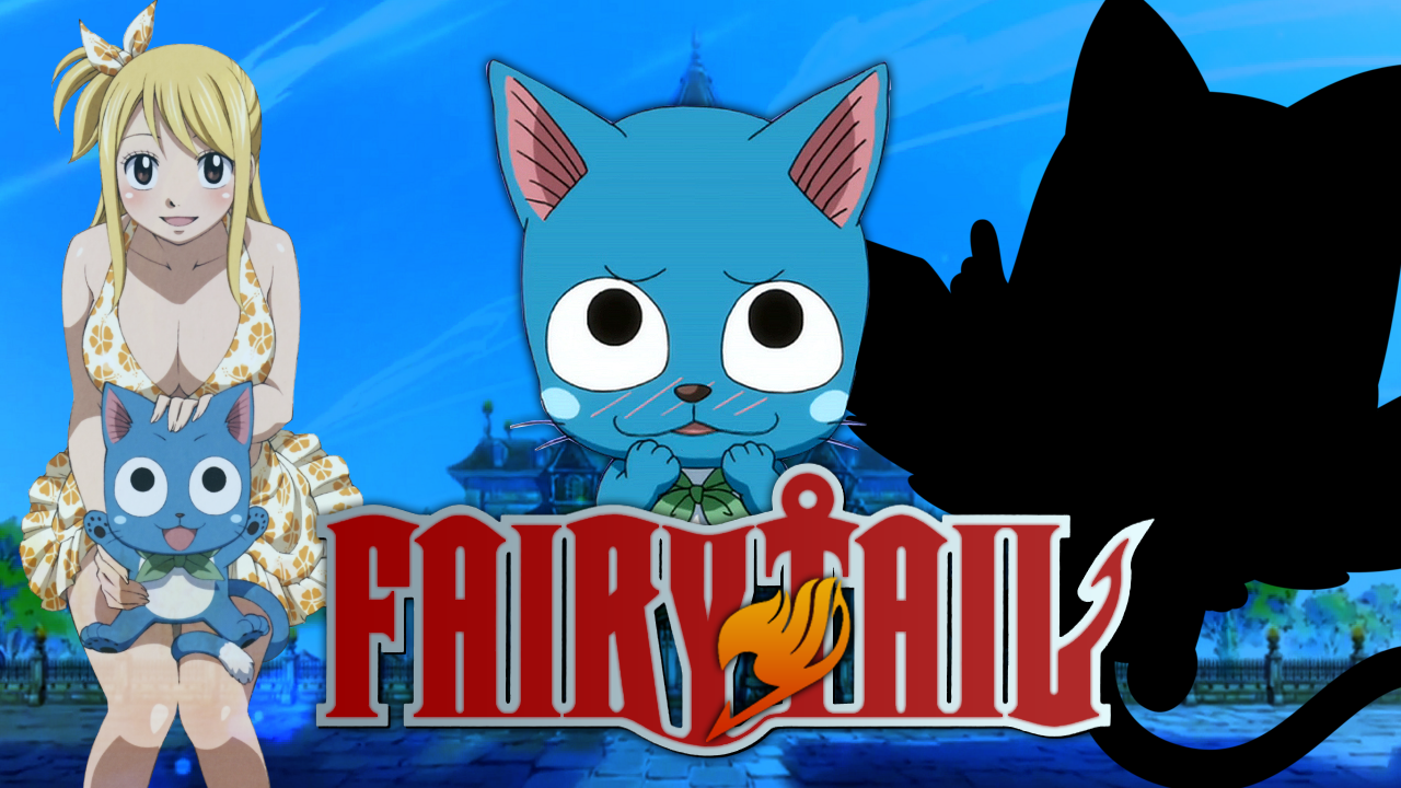 Description: A cartoon character with a cat and a girl in front of a background with the word fairy tail on it.
