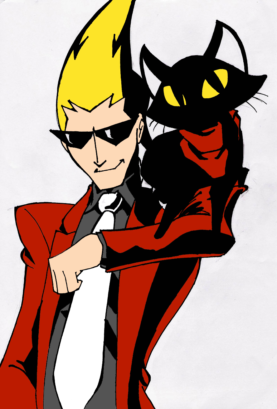 Description: A cartoon character with a cat on his shoulder and a cat on his shoulder.