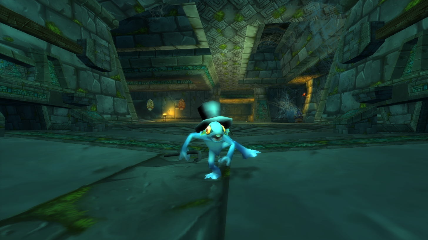Description: A cartoon character in a dark room with a stone fireplace and a stone archway in the background.
