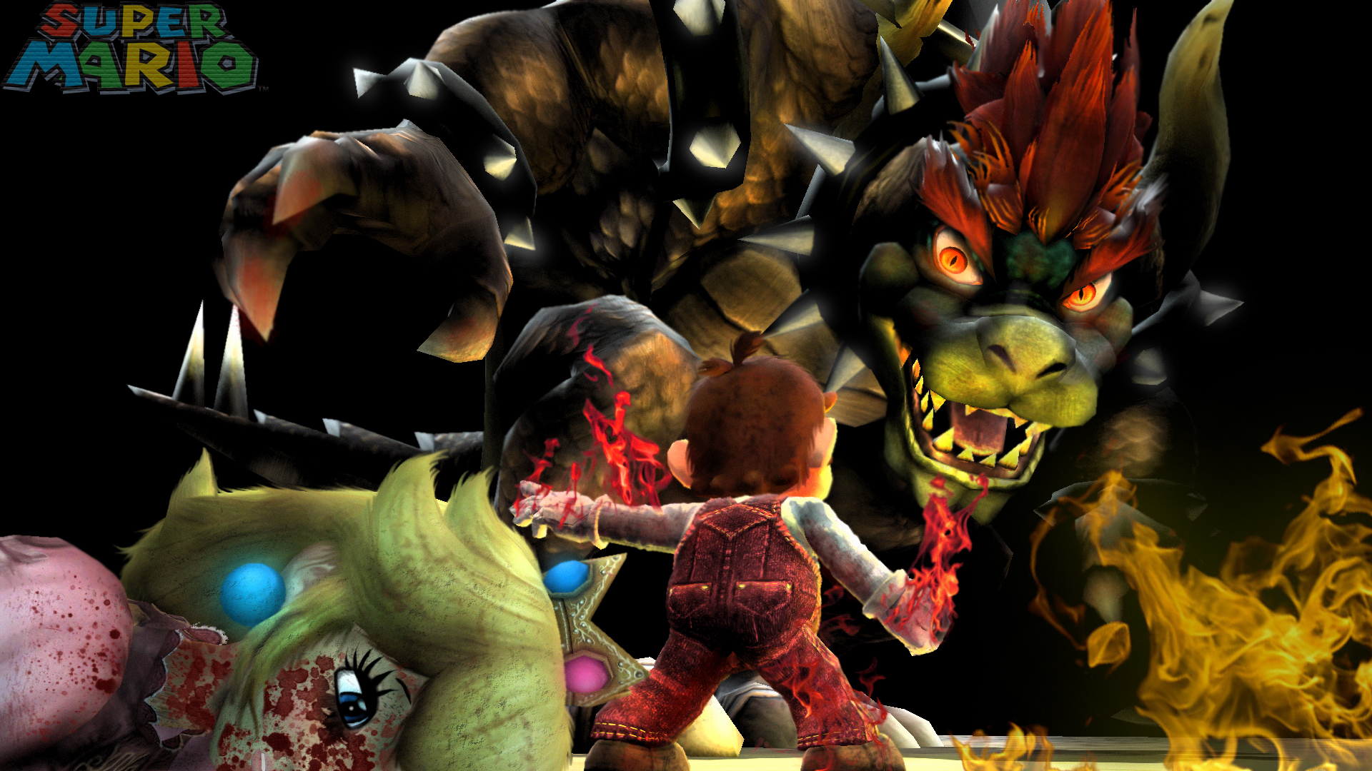 Description: A cartoon character standing next to a fire demon and a demon demon with a knife in his hand and a demon with a knife in his hand.
