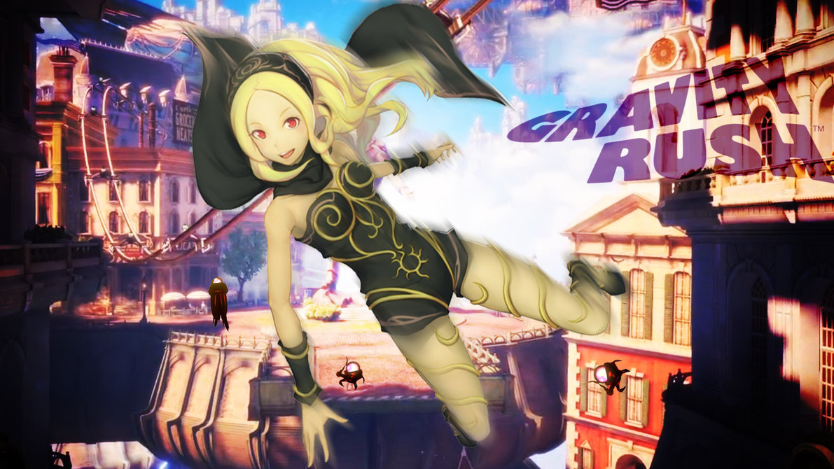 Description: A cartoon character flying through the air over a city with buildings and a giant sign that says gravity rush.