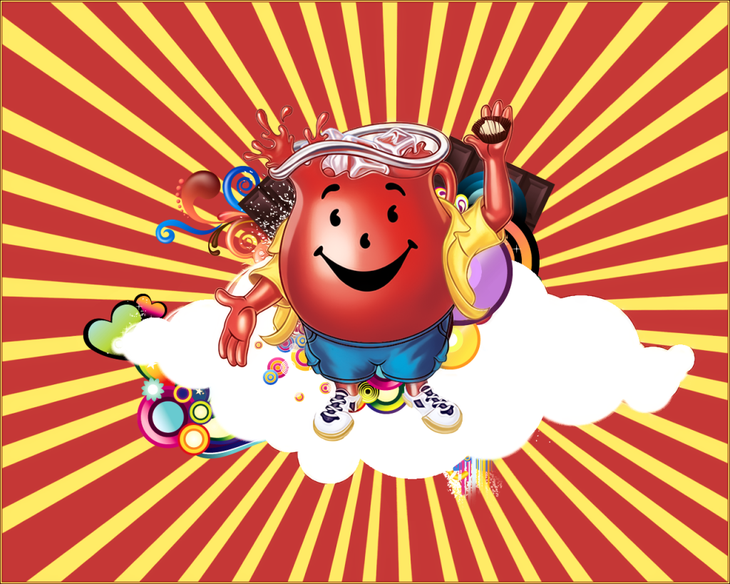Description: A cartoon character is flying through the air on a cloud with a smile on his face and a lot of other objects around him.