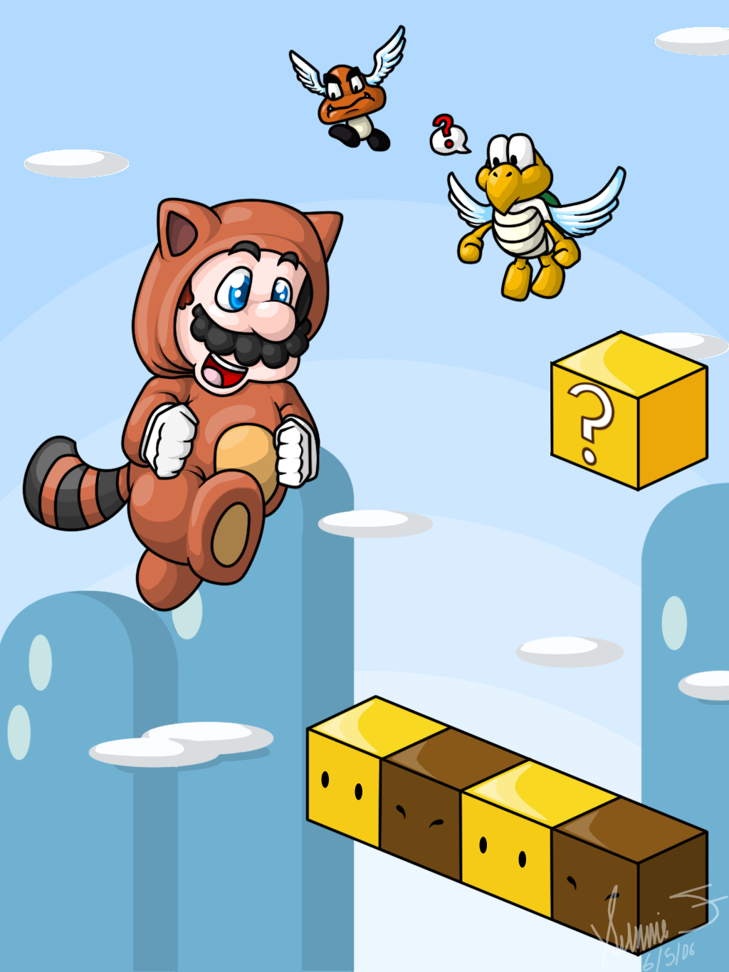 Description: A cartoon character is flying over a game platform with a cat and bird on it and a bird flying over the platform.