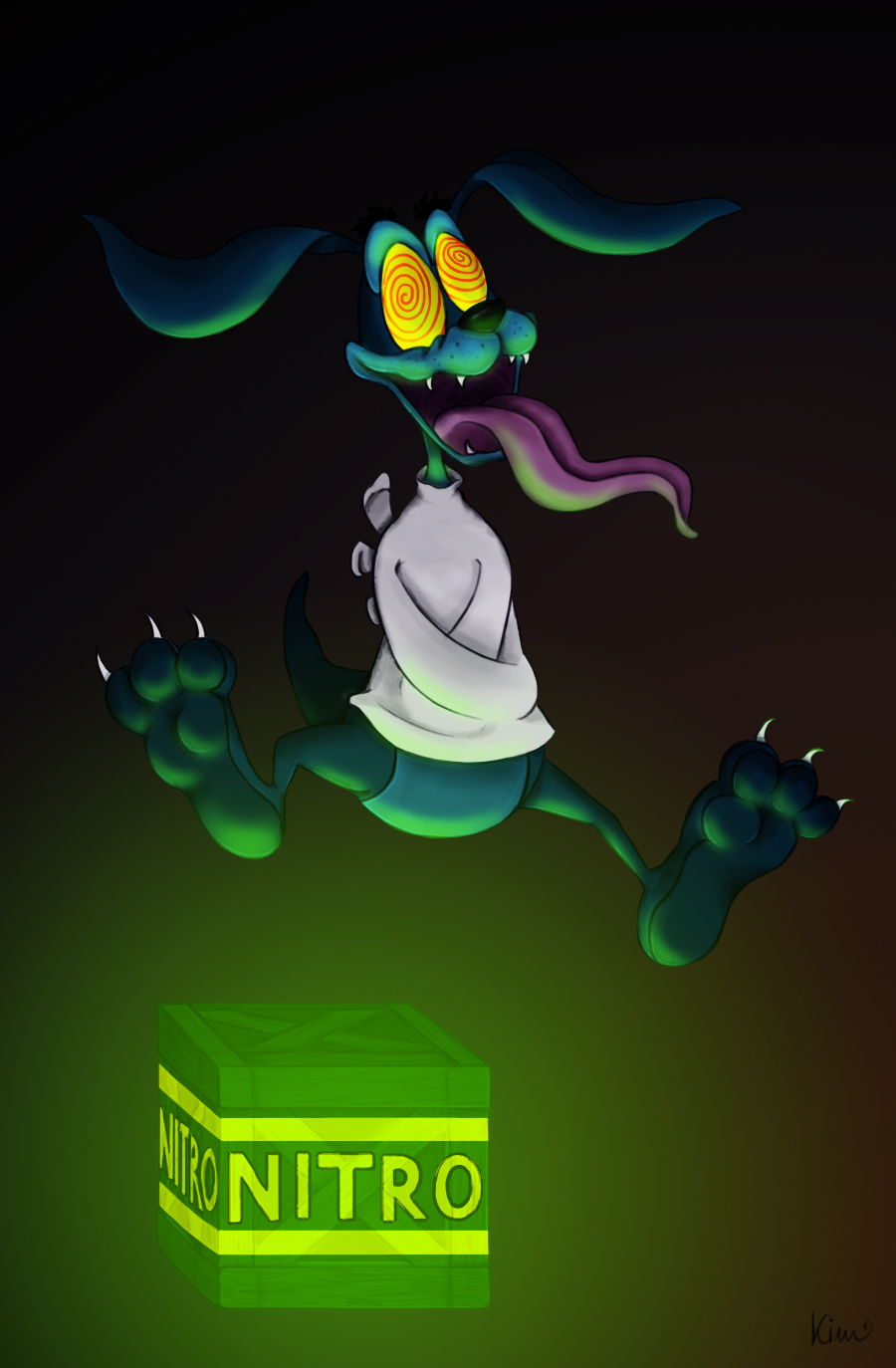 Description: A cartoon character is flying over a box of nitro powder and a butterfly is flying over it.
