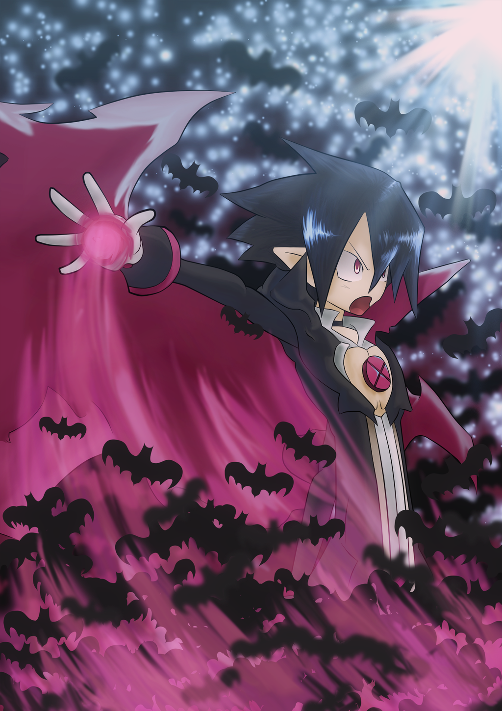 Description: A cartoon character is flying through the air with a pink umbrella in her hand and bats in the background.
