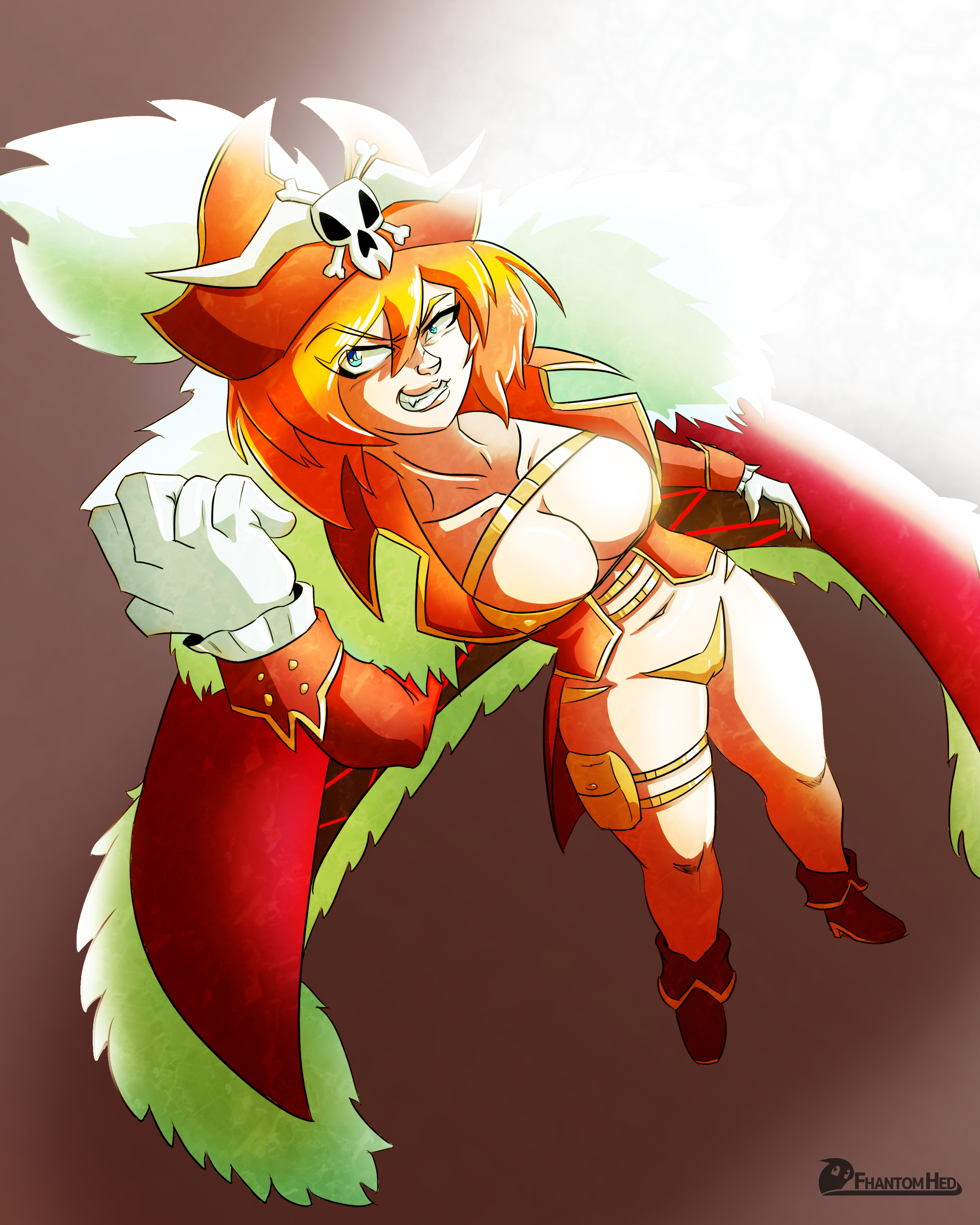 Description: A cartoon character is flying through the air with a red and green tail and a white face and tail.