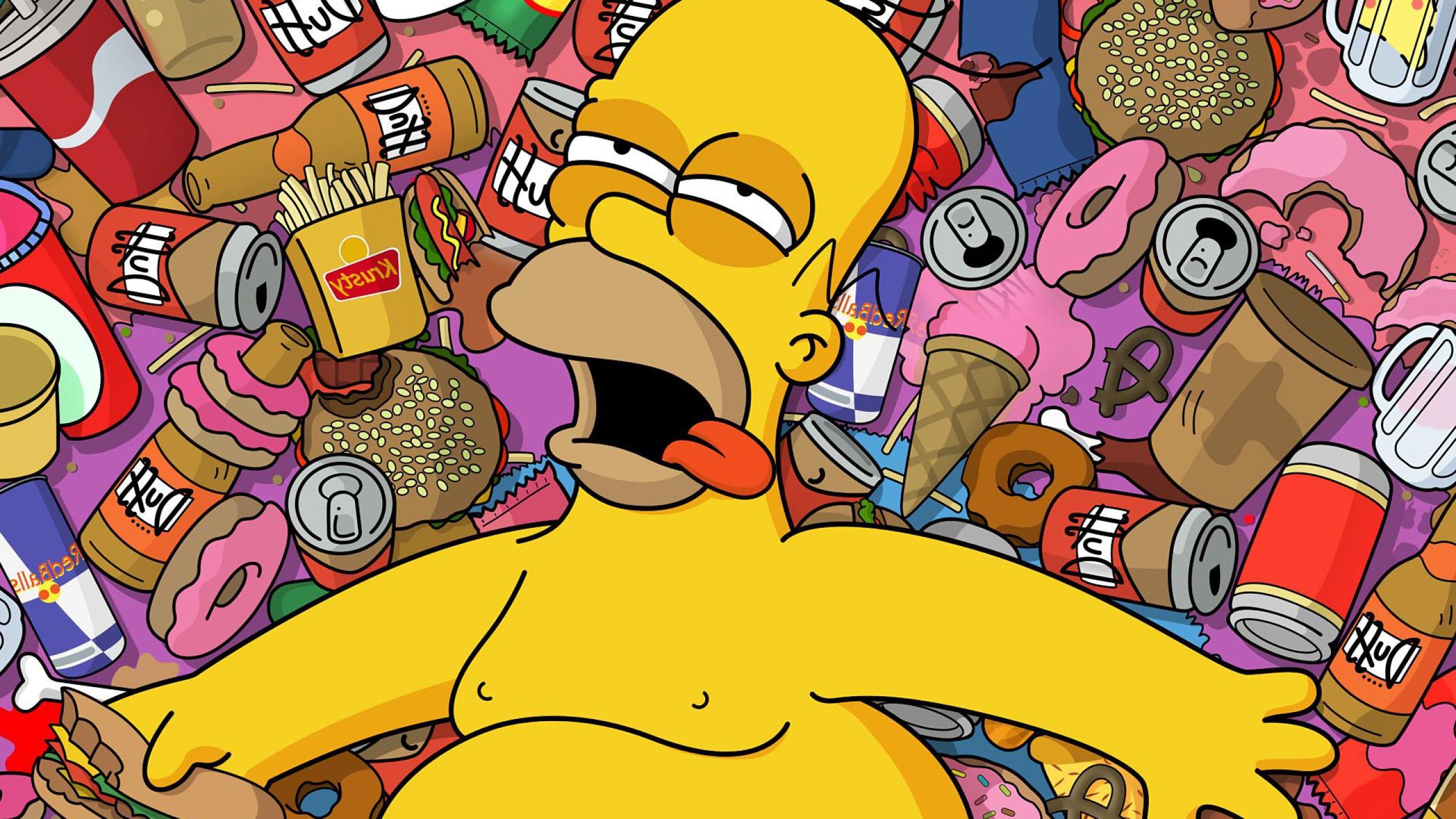 Description: A cartoon character with a lot of food and drinks in the background of a bunch of junks and junk.