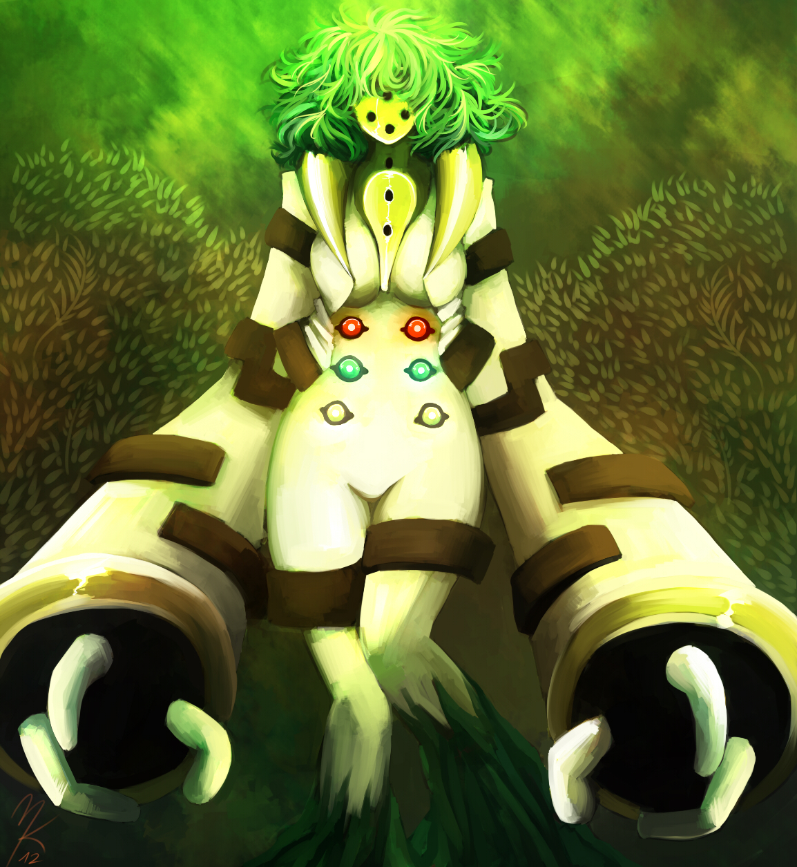 Description: A cartoon character with green hair and a green outfit on holding a large pair of binoculars in front of a green background.