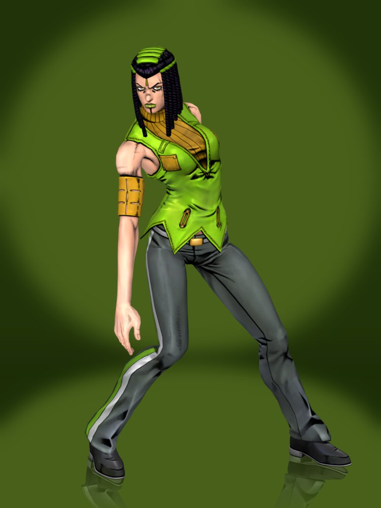 Description: A cartoon character in a green outfit with a yellow belt and black shoes.