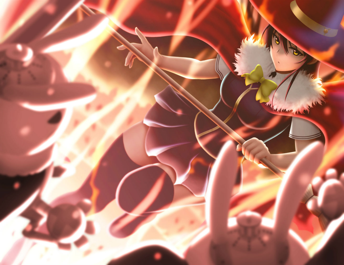 Description: A cartoon character with a hat and a broom in a fire scene with a cat and a dog in the background.