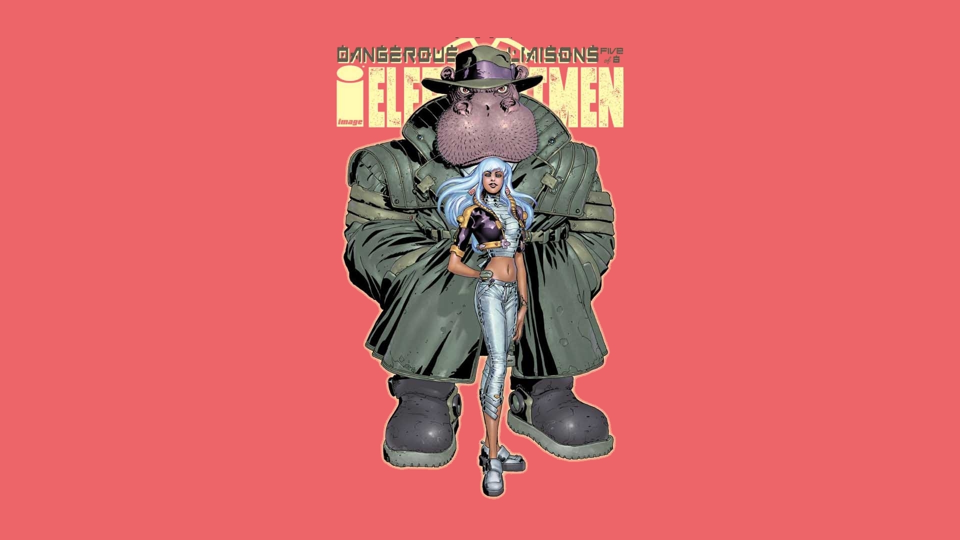 Description: A cartoon character with a hat and a cane standing in front of a pink background with a woman in a green coat.