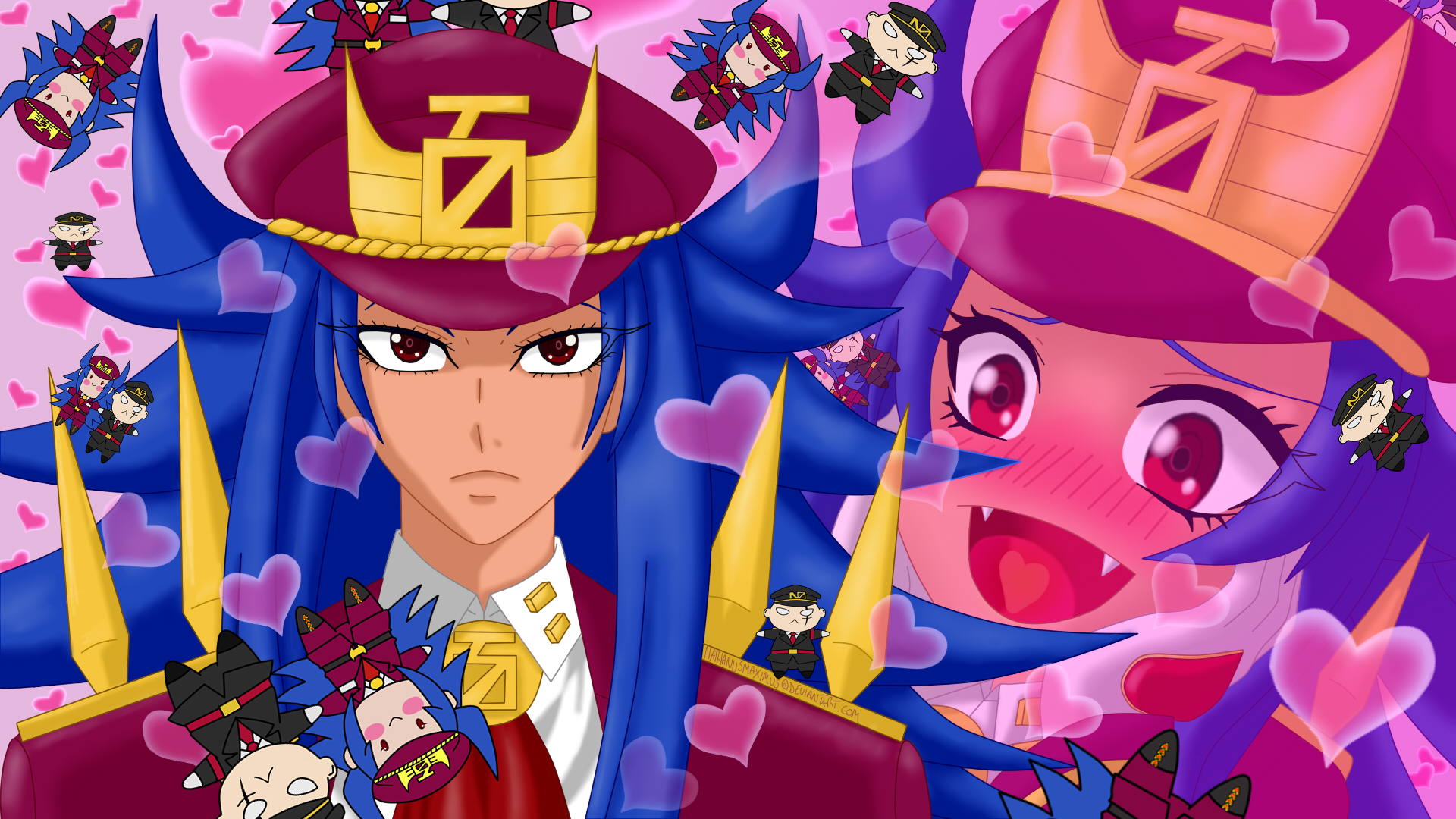 Description: A cartoon character with a hat and a suit on and a cat and dog on his chest and a man in a red hat.