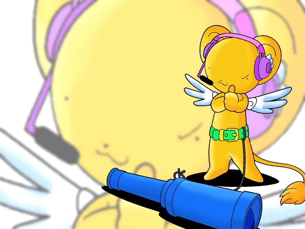 Description: A cartoon character with headphones on and a telescope in his hand and a yellow bear with wings on.