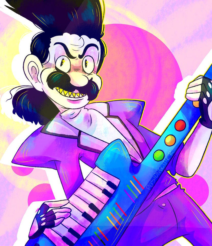 Description: A cartoon character holding a giant blue instrument with a mustache and mustache on it's head.