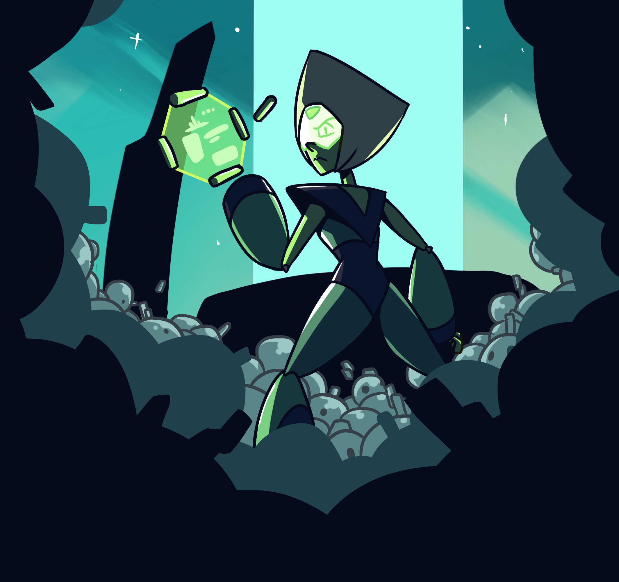Description: A cartoon character holding a green object in a cave with a giant green object in the background and a man in a black suit.