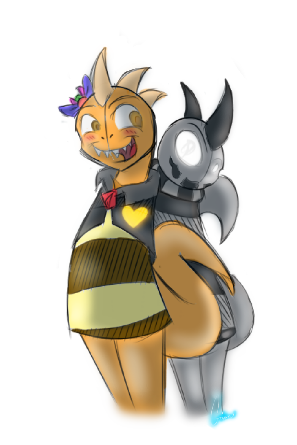 Description: A cartoon character hugging a cat with a demon on it's back and a demon on his arm.