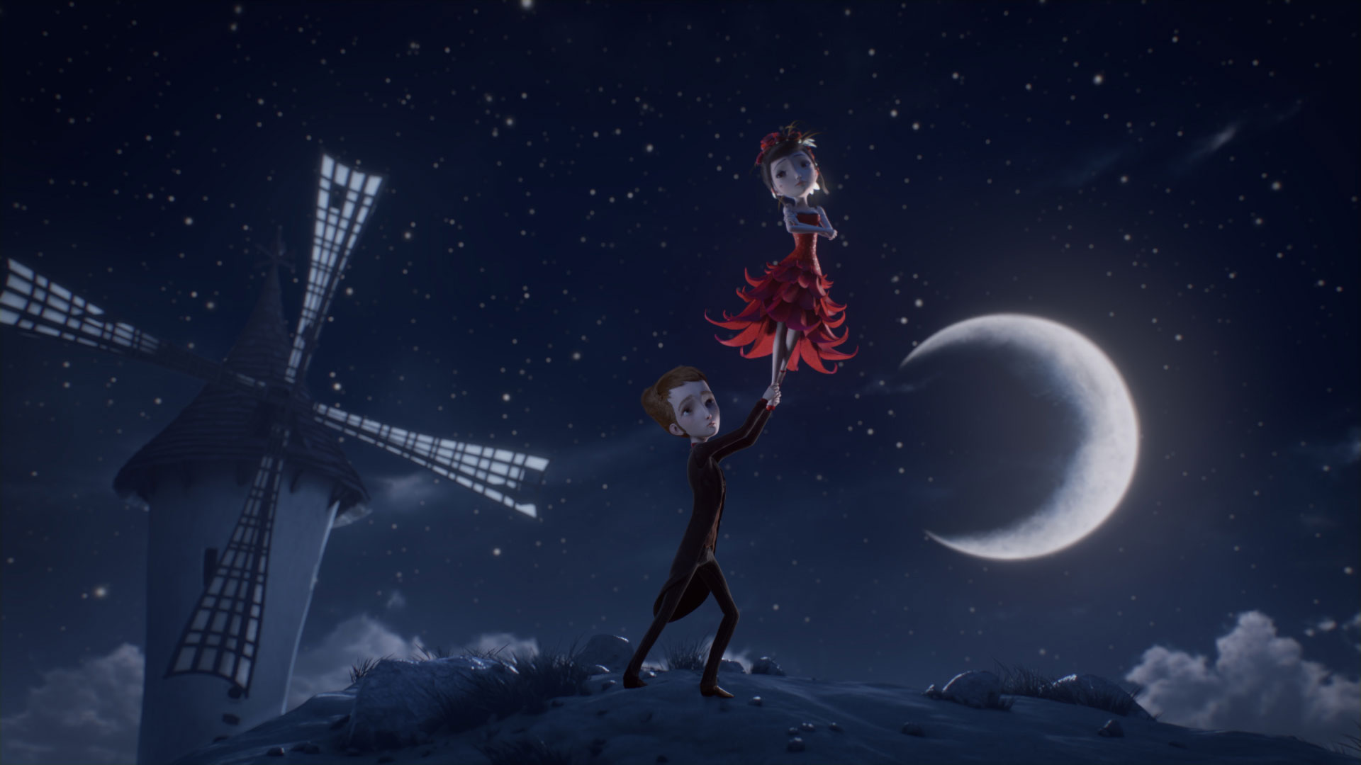 Description: A cartoon character holding a lantern in front of a windmill and a moon in the sky with a full moon behind it.
