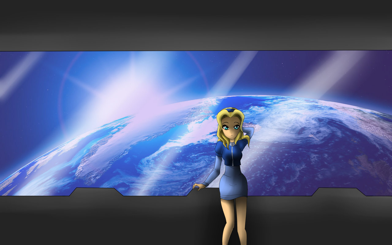 Description: A cartoon character is standing in front of a large screen with a blue planet in the background and a blue sky.
