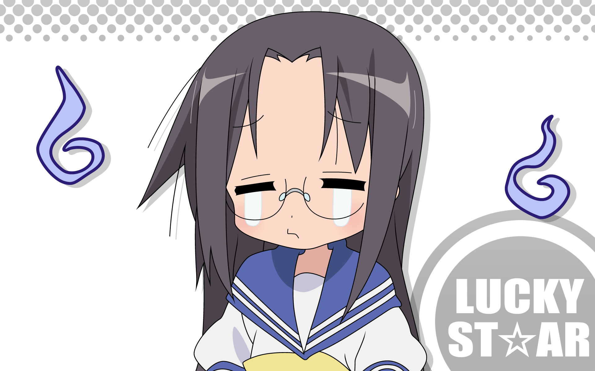 Description: A cartoon character with long hair and glasses holding a heart shaped object in her hands and a caption that reads lucky star.