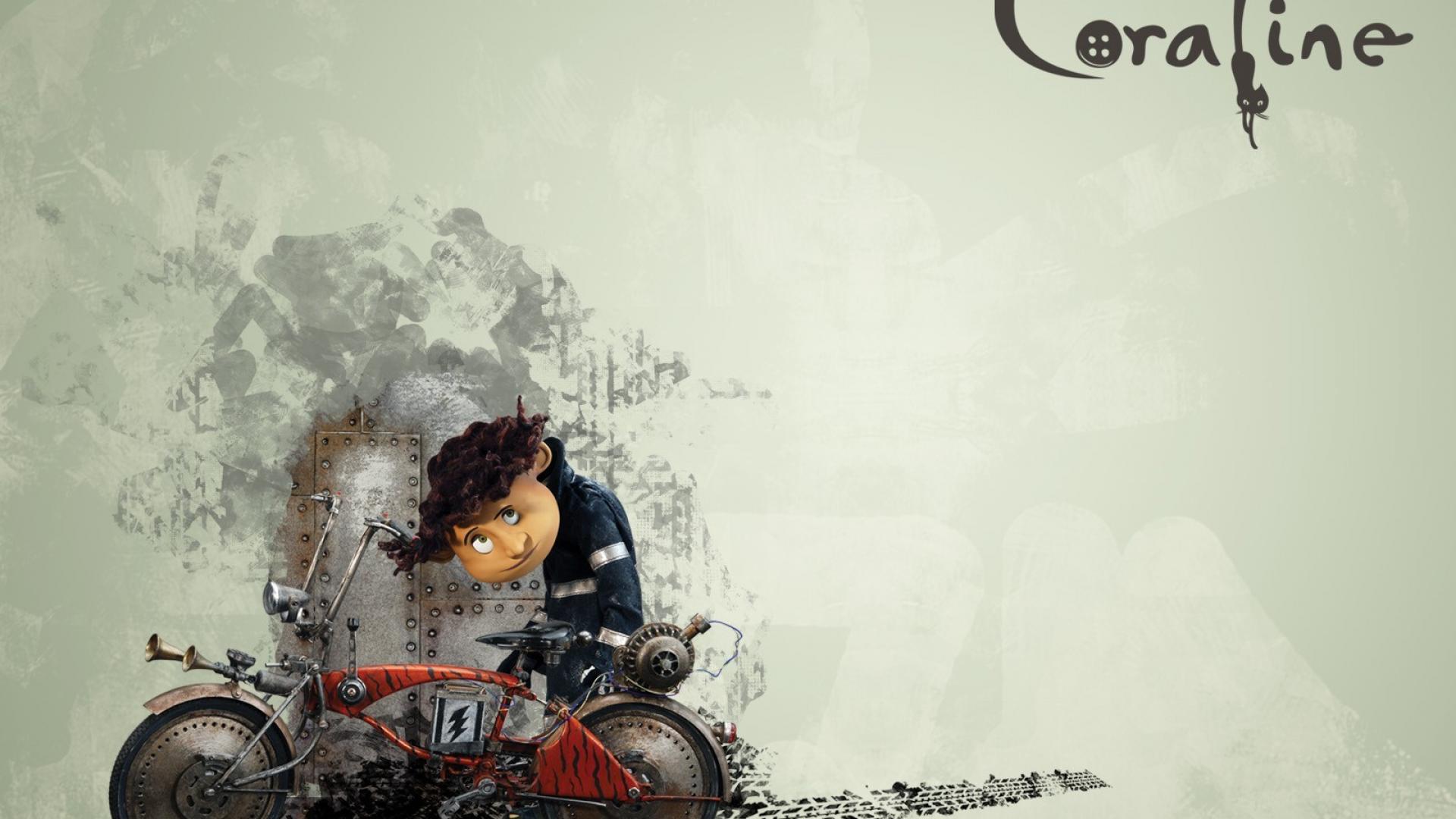 Description: A cartoon character riding a motorcycle with a guitar on the back of it's seat and a caption that reads coraline.