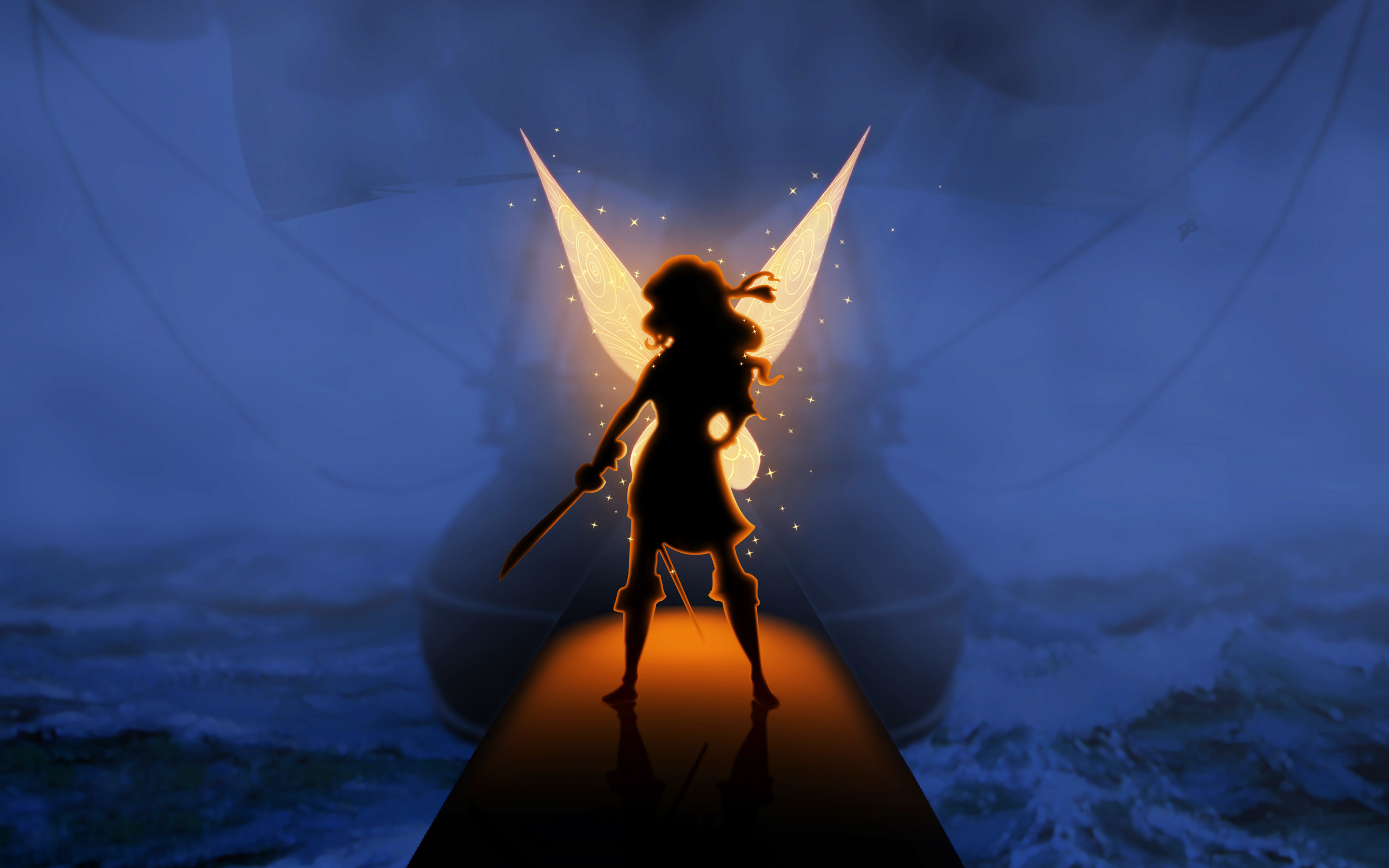 Description: A cartoon character standing on a pier with a sword in his hand and a glowing angel behind him.
