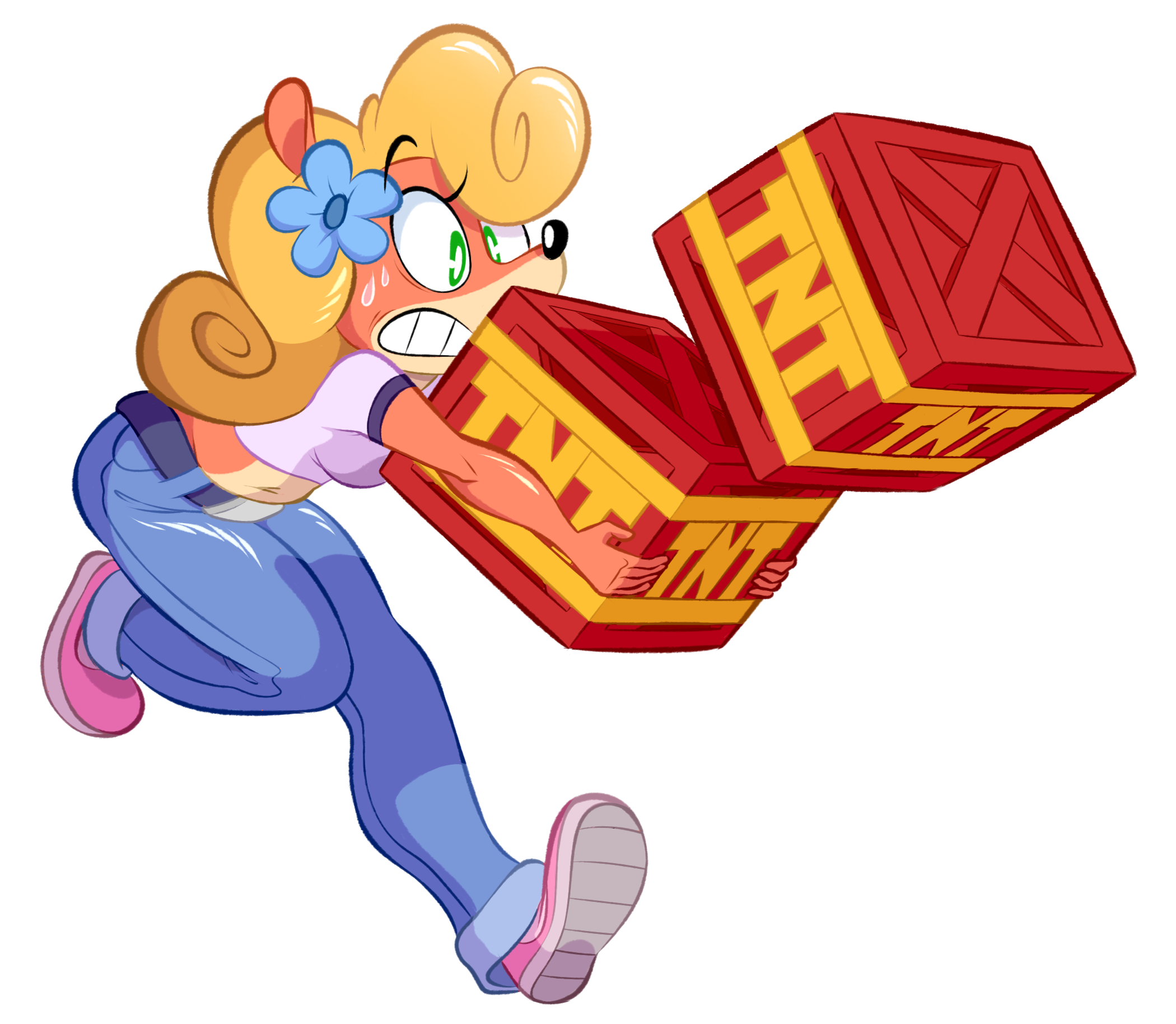 Description: A cartoon character carrying a box of pizza on his back with a face on it's face and a flower on his head.
