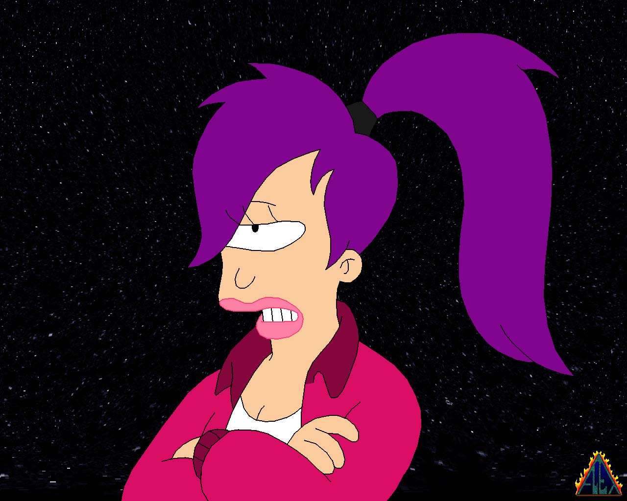 Description: A cartoon character with purple hair and a pink shirt on.