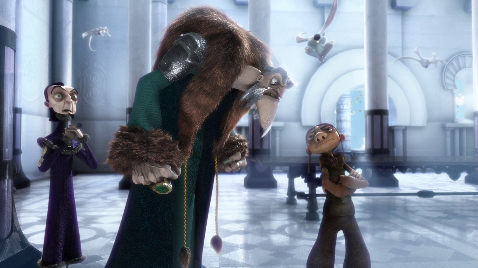 Description: A cartoon character is standing in a room with other characters in the background and a woman in a green dress.