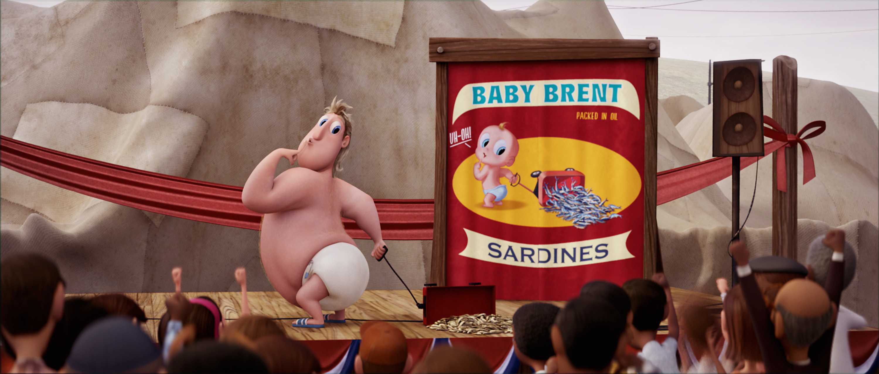 Description: A cartoon character is on stage with a microphone and a microphone in his hand and a sign in the background.