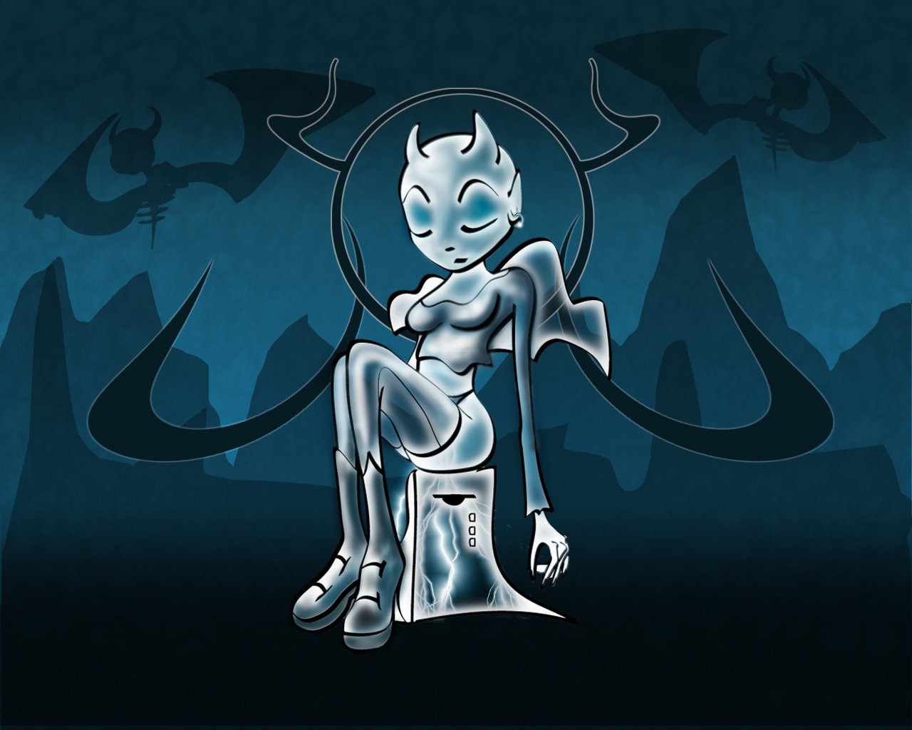 Description: A cartoon character sitting on a stool with a demon on it's back and a demon on his arm.