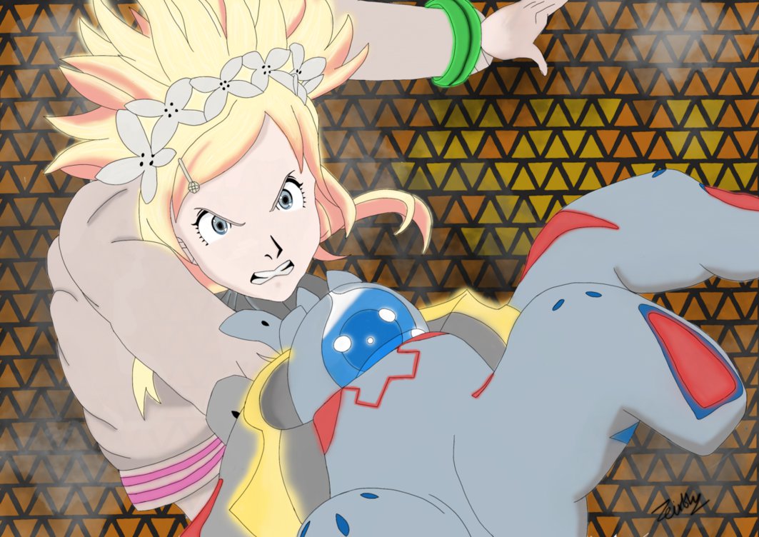 Description: A cartoon character is holding a stuffed animal in front of a wall with a pattern on it and a person is pointing.