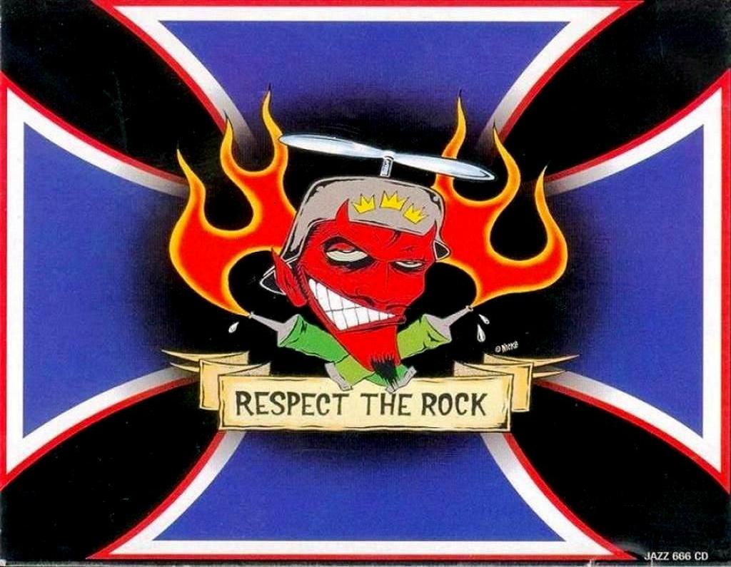 Description: A picture of a cartoon character with a sword and a banner on it that says respect the rock on it.