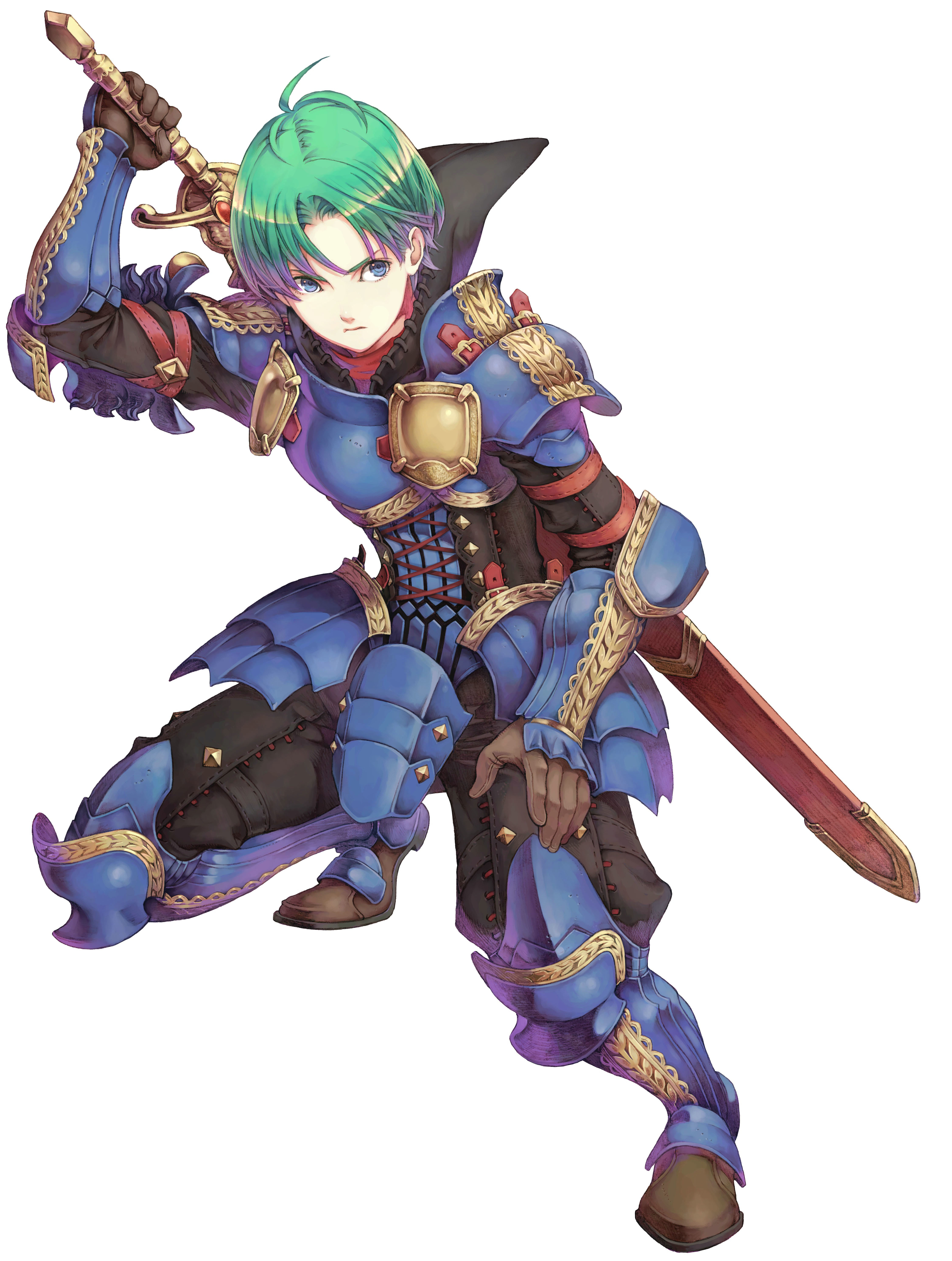 Description: A cartoon character with a sword and a blue outfit and green hair.