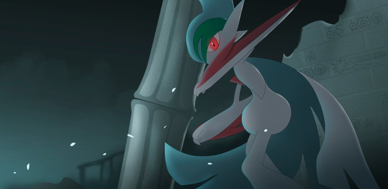 Description: A cartoon character with a sword in her hand and a demon in the background with a red eye and a green head.