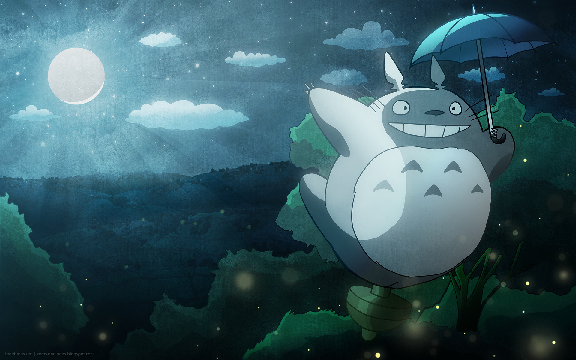 Description: A cartoon character holding an umbrella in the night sky with a full moon in the background and stars in the sky.