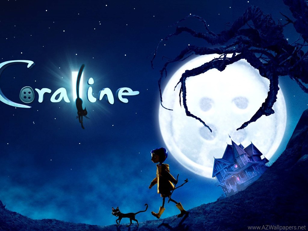 Description: A cartoon character walking a dog in front of a full moon with a creepy house in the background and a creepy tree.