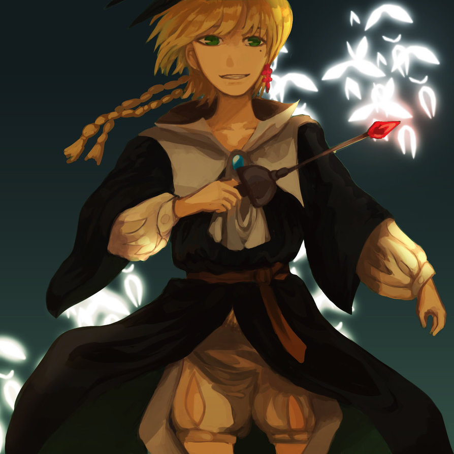 Description: A cartoon character holding a wand and a flower in her hand with a lot of butterflies flying around her.