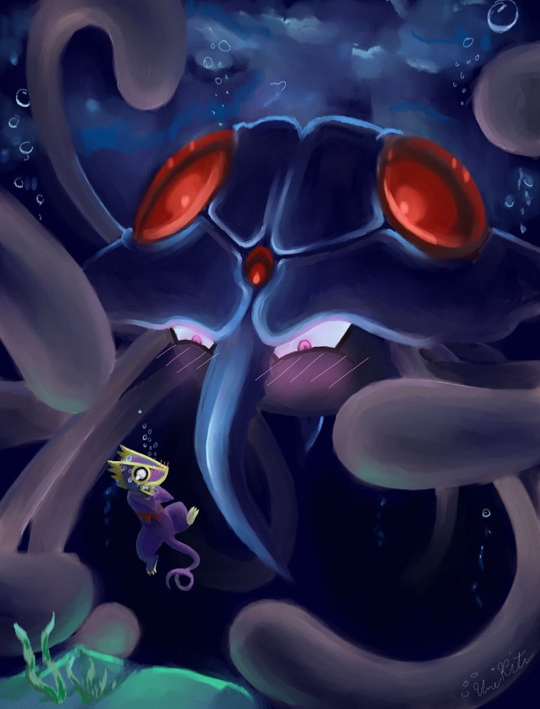 Description: A cartoon character is in the water with a fish in his mouth and a fish in his mouth is in the water.