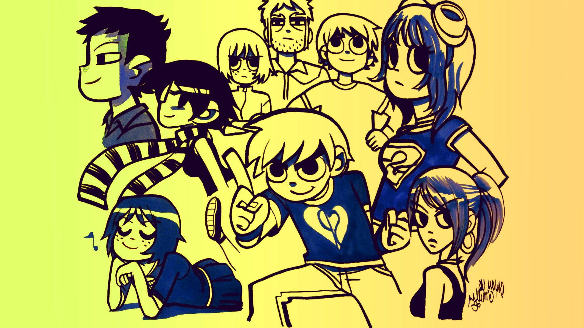 Description: A group of cartoon characters are drawn in blue and yellow colors on a yellow background with a black outline.