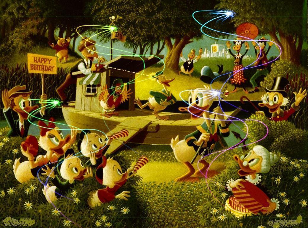 Description: A painting of a group of cartoon characters dancing around a park area with a happy hour sign in the background.