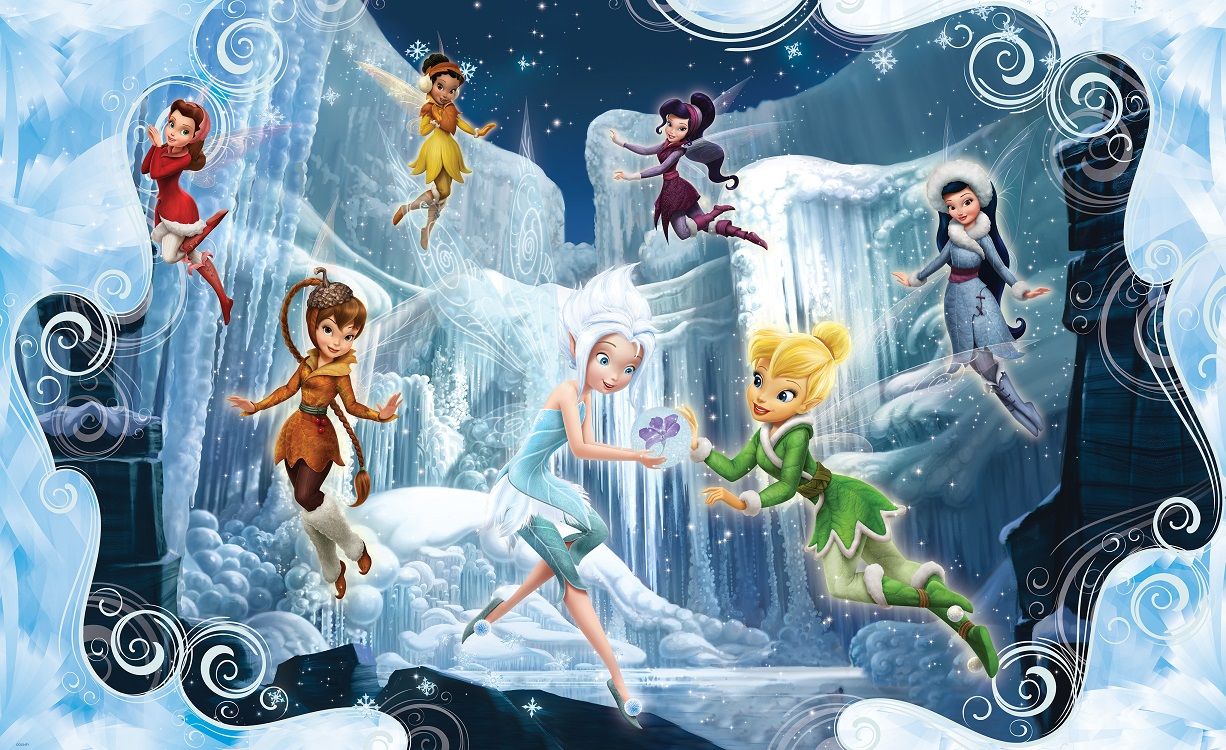 Description: A group of cartoon characters flying through the air in front of a waterfall with snow and ice falls behind them.