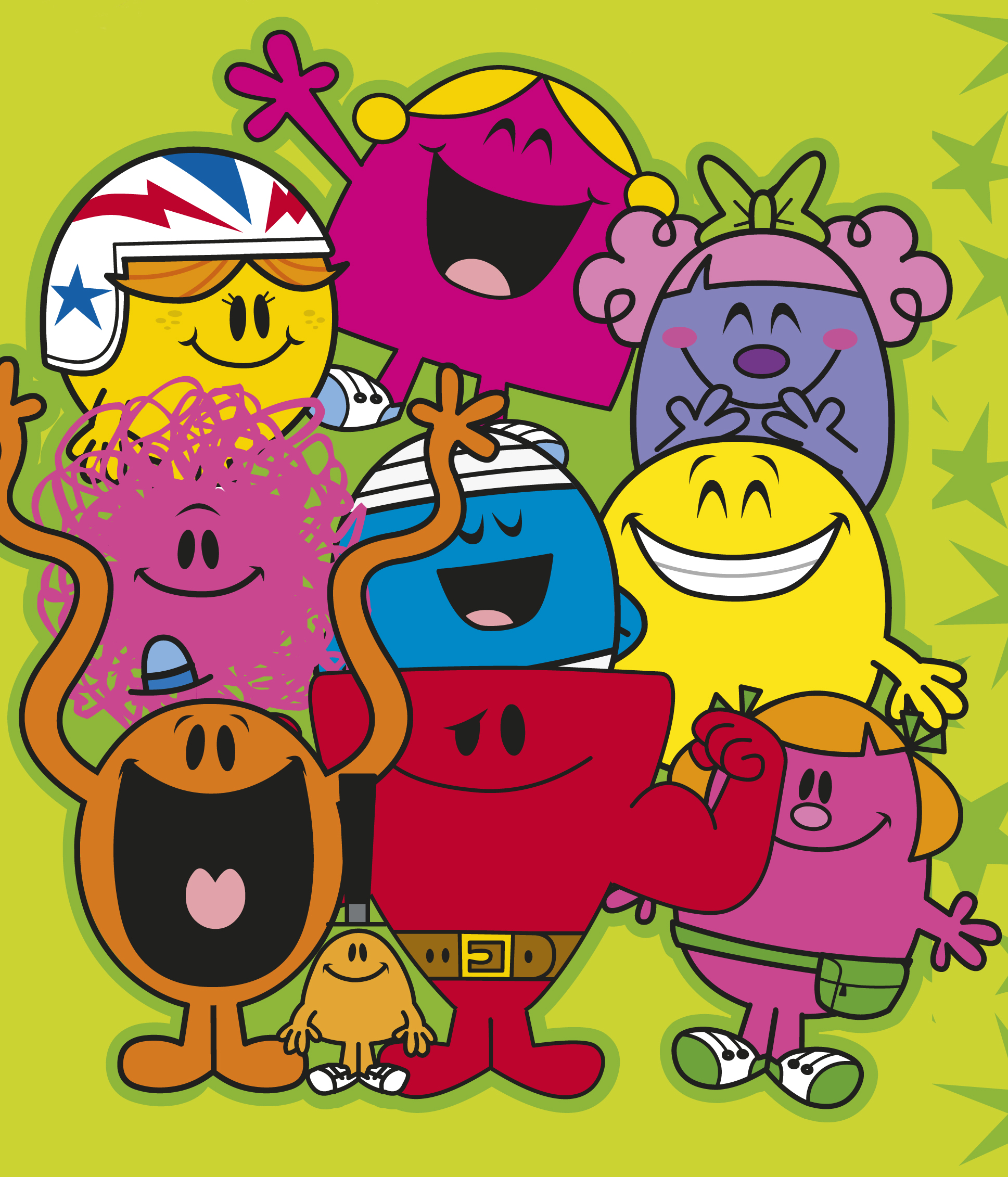 Description: A group of cartoon characters with a green background with stars and a starburst on it's back.