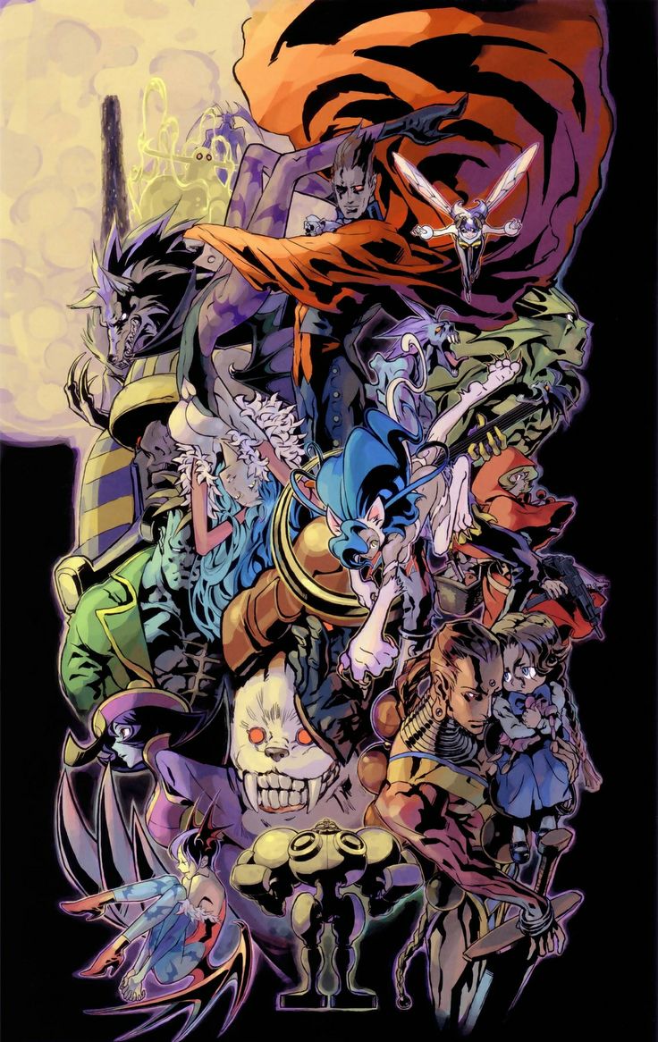 Description: A bunch of cartoon characters are in a group together on a black background with a full moon in the background.