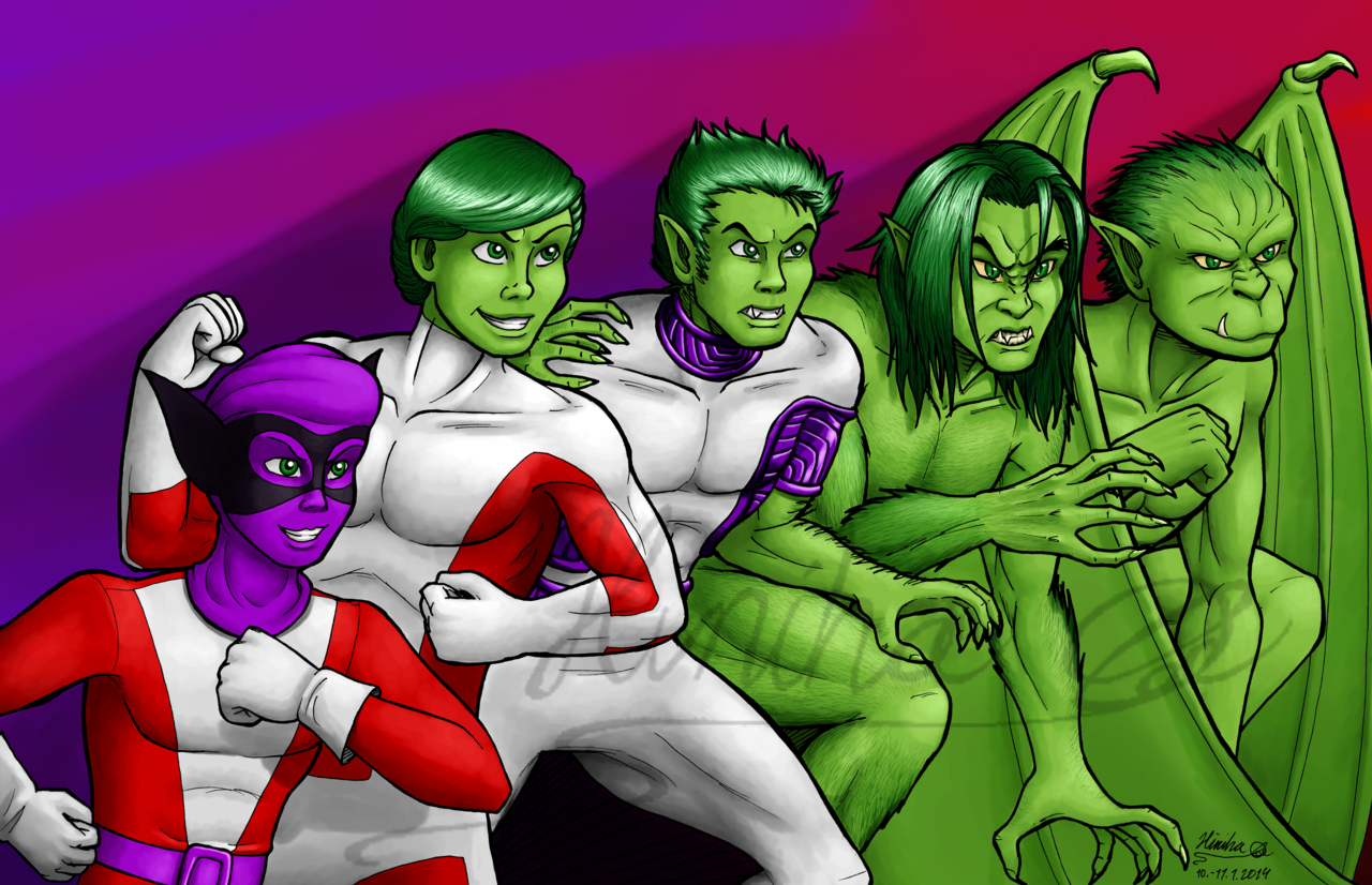 Description: A group of cartoon characters standing next to each other in front of a purple background with a green and red color scheme.