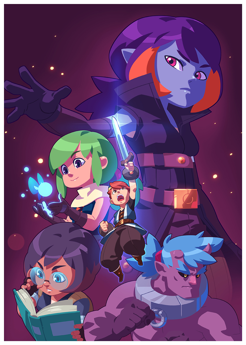 Description: A group of cartoon characters standing next to each other in front of a purple background with stars and a sky.